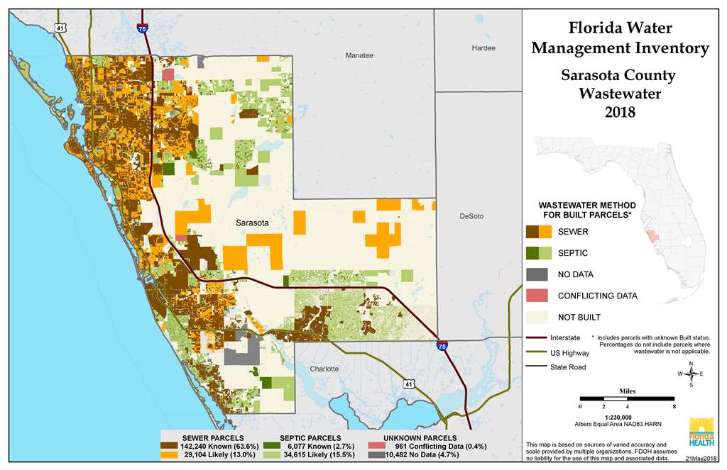 A GIS-based exercise followed by ground-truthing is required to strengthen our knowledge of the number of septic systems, their location, and status in Sarasota County. The Sarasota County property appraiser database showing all parcels should be the base layer. Vacant parcels and parcels currently serviced by central sewer should be identified and excluded. This map should be compared to the FDOH and Sarasota County Government maps and discrepancies identified and updated. This process could involve ground-truthing through queries to utilities, HOAs, neighborhoods, and individual homeowners. The goal should be to develop a place-based inventory of parcels with “known” septic systems or “known” sewer service.